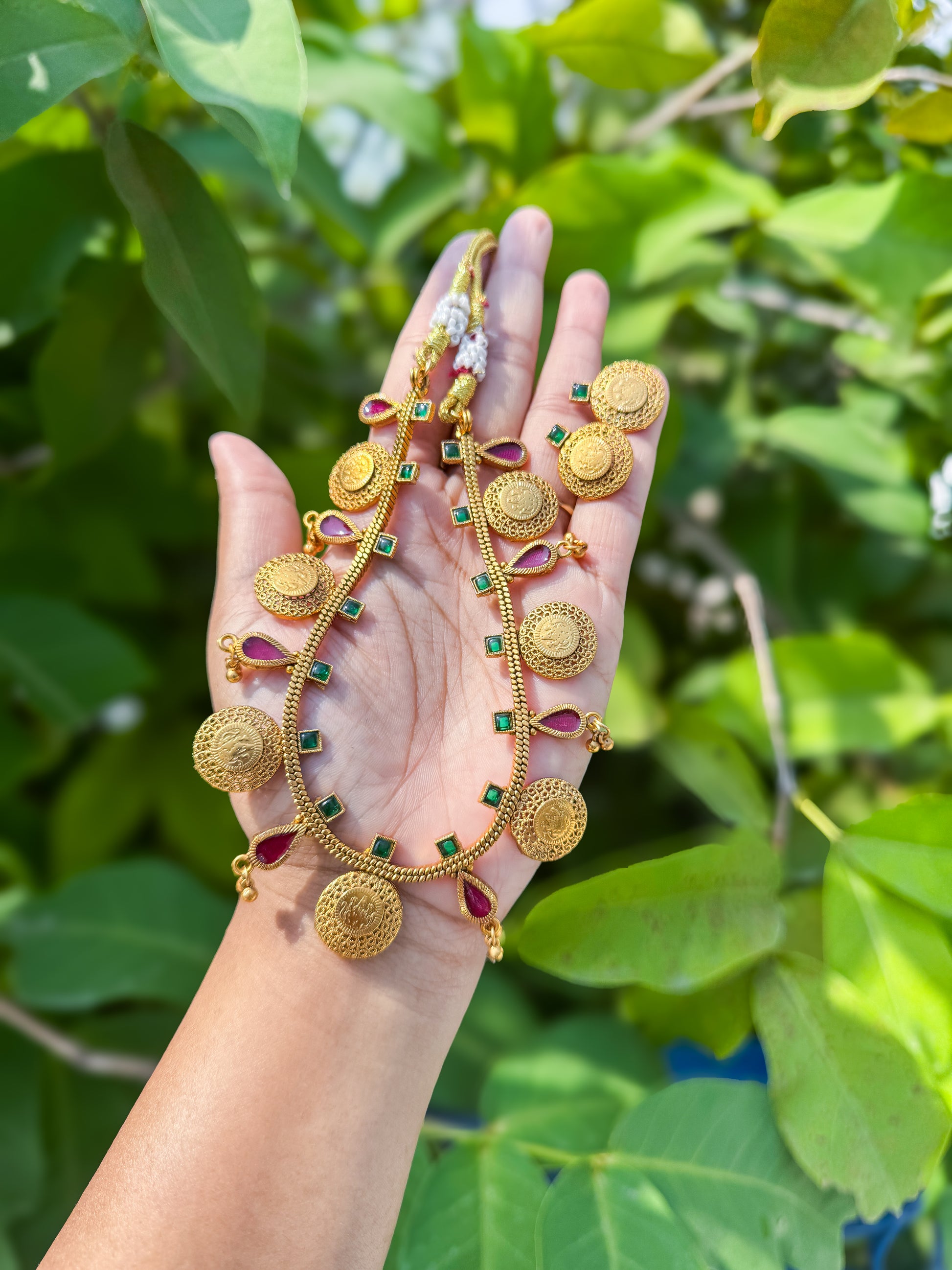 Embrace timeless tradition with this Antique jewellery collection, beautifully paired with matching Earring. Featuring intricate temple jewellery craftsmanship and divine motifs, this set symbolizes heritage, prosperity, and grace. Perfect for weddings, festive occasions, and cultural celebrations, it adds a regal charm to every look.