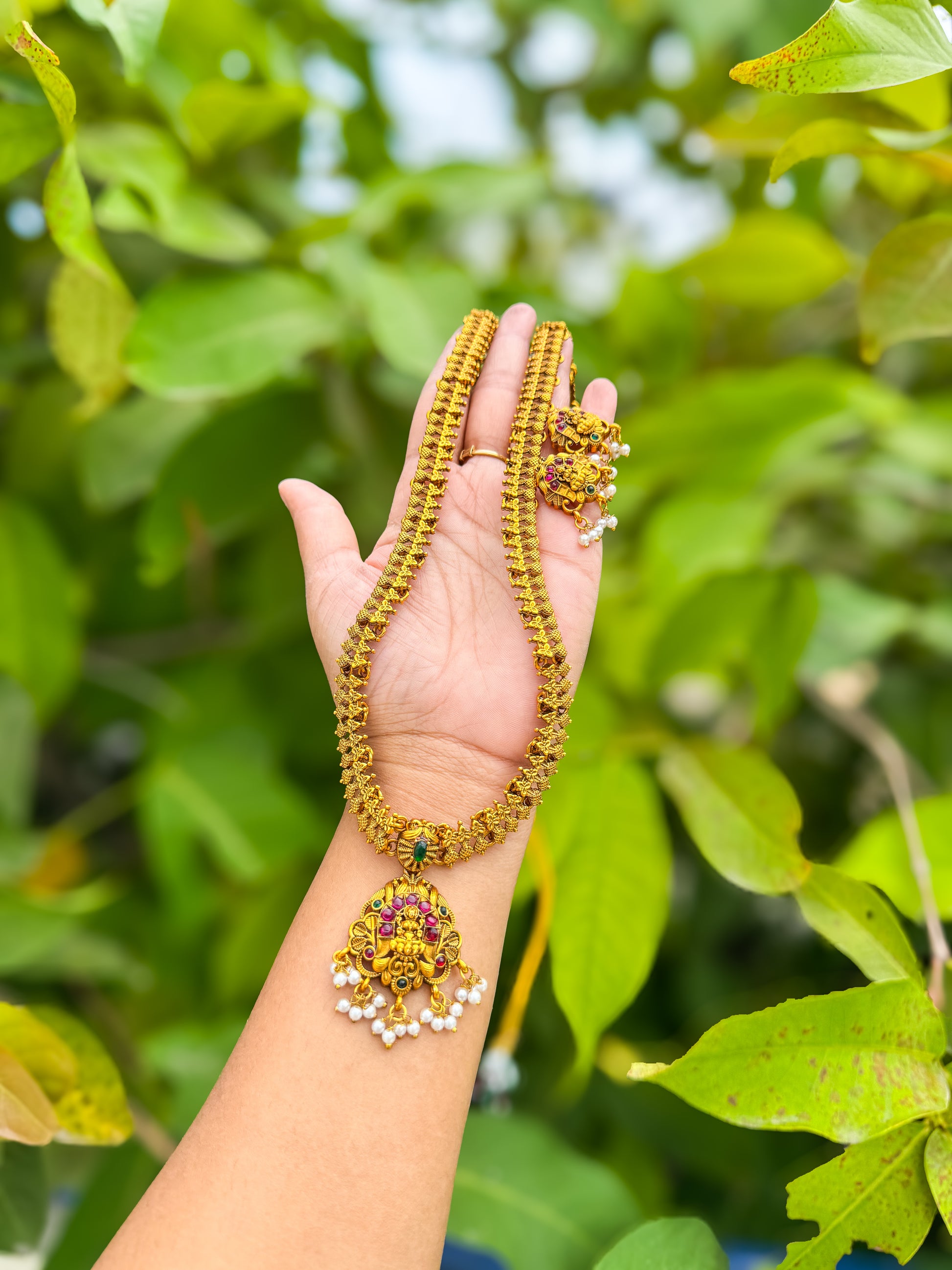 Embrace timeless tradition with this Antique jewellery collection, beautifully paired with matching Earring. Featuring intricate temple jewellery craftsmanship and divine motifs, this set symbolizes heritage, prosperity, and grace. Perfect for weddings, festive occasions, and cultural celebrations, it adds a regal charm to every look.
